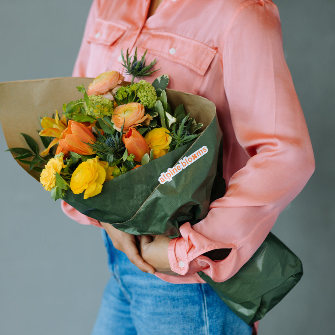 Lush seasonal blooms delivered without a vase in a Kraft paper wrap.