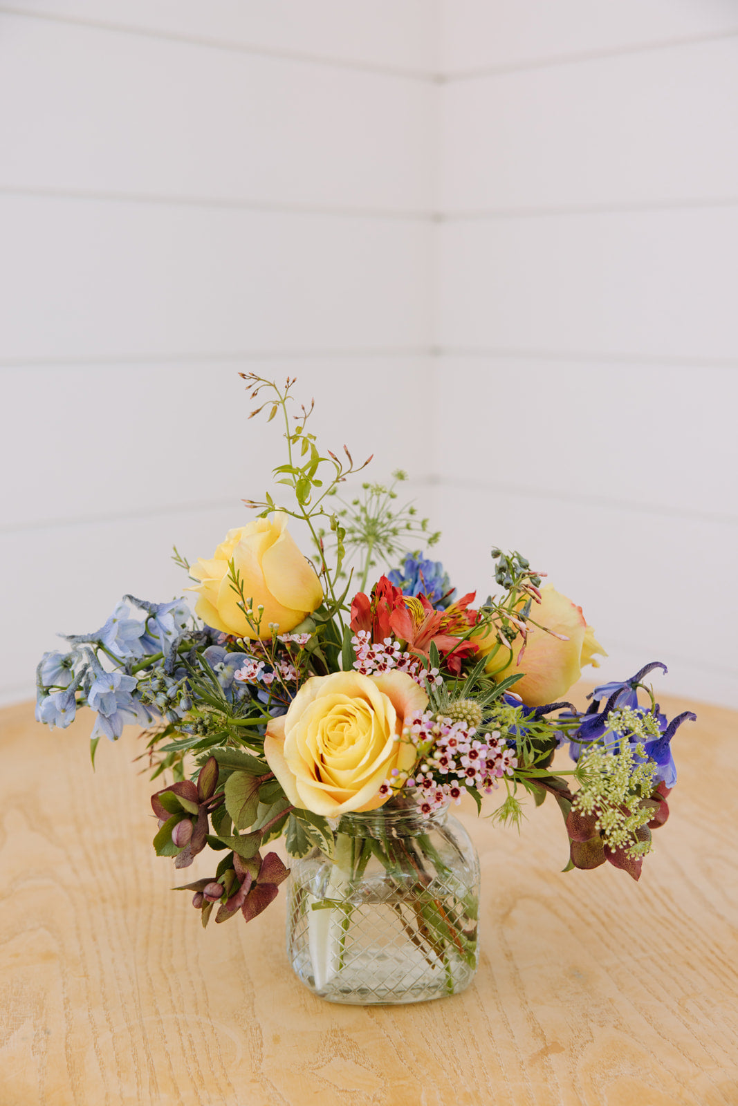 Cheerful yellow roses, soft blue delphinium, and pops of red create a joyful, mountain-inspired palette — fresh, wild, and full of character.