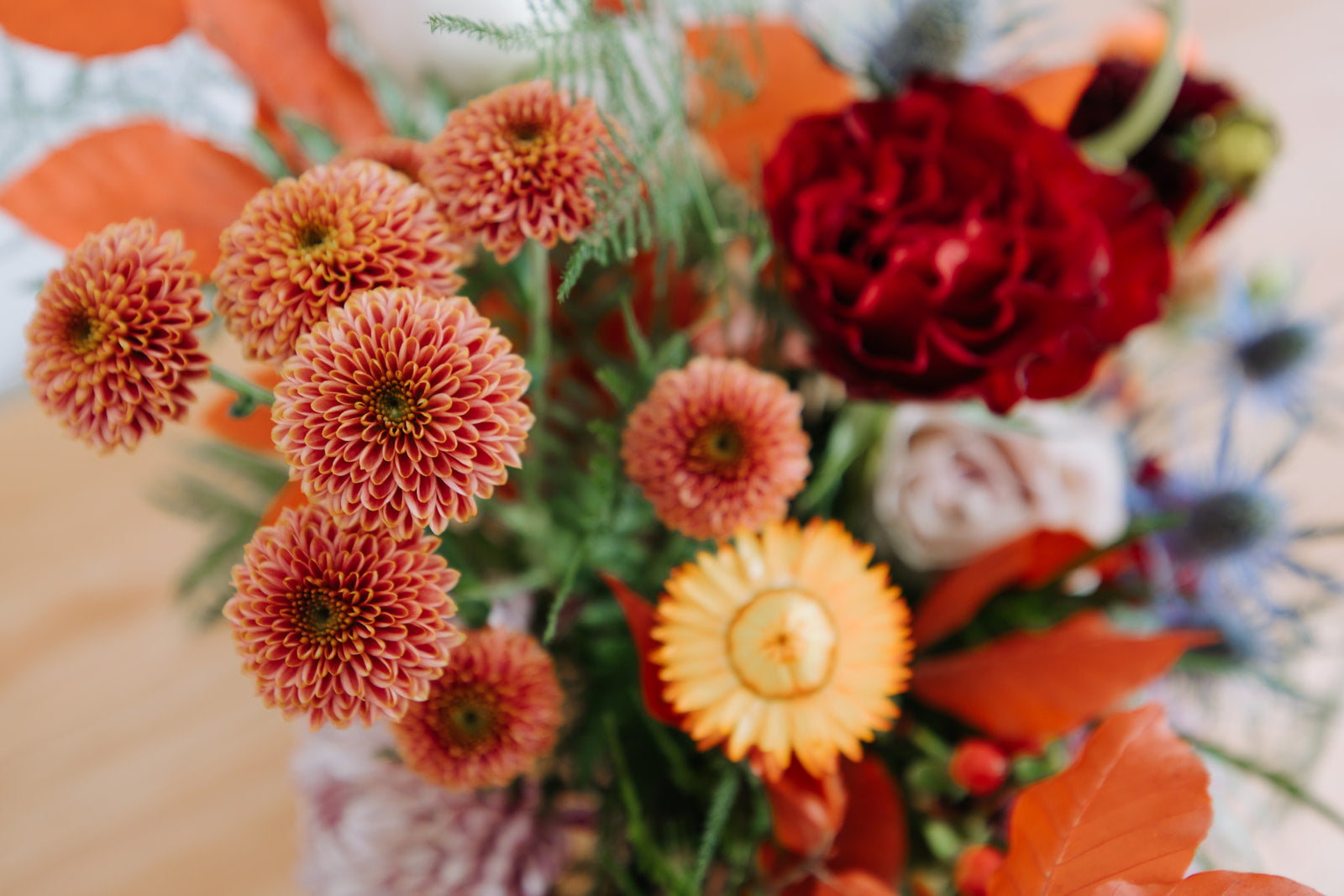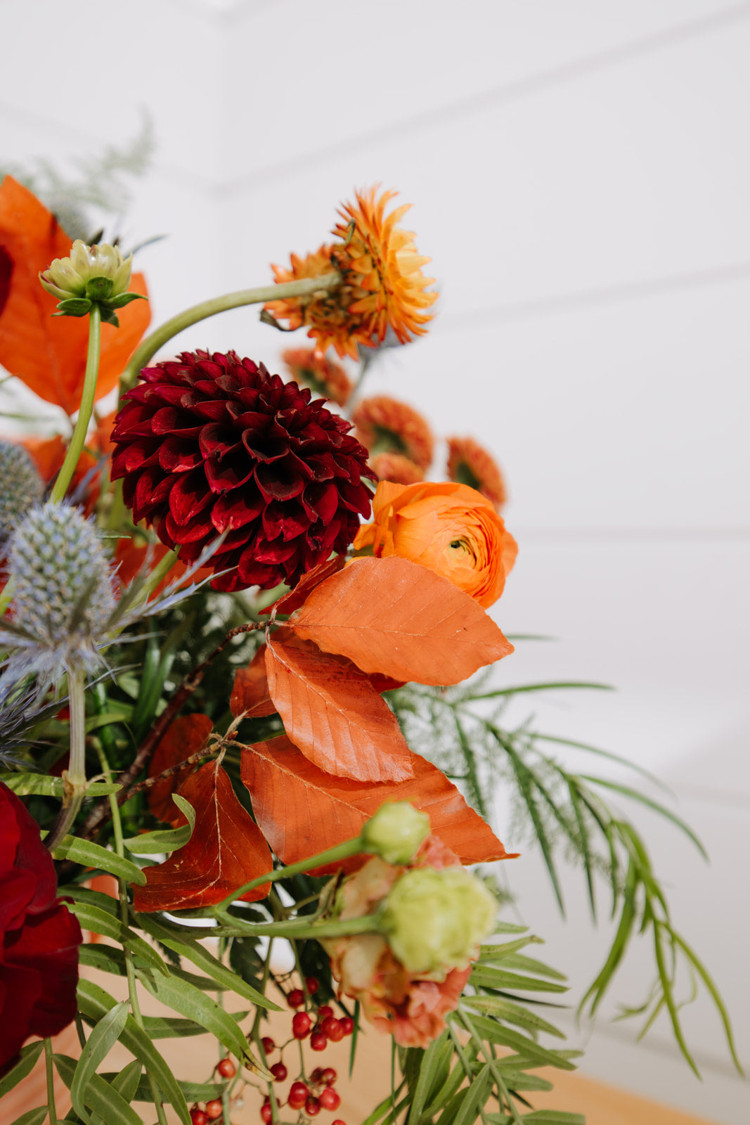 Rich reds, rust, and copper tones mingle with deep plum and cool thistle blue. A lush, woodsy arrangement that captures the warmth and drama of fall in the mountains.