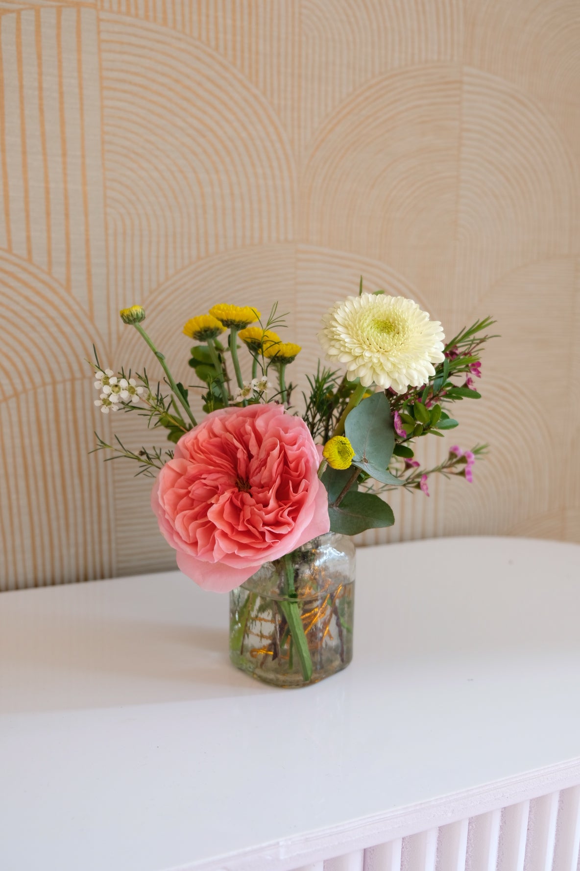 A bright and joyful mini arrangement filled with fresh seasonal blooms. Designed to bring a little burst of happiness to any space — simple, stylish, and full of Alpine Blooms charm.