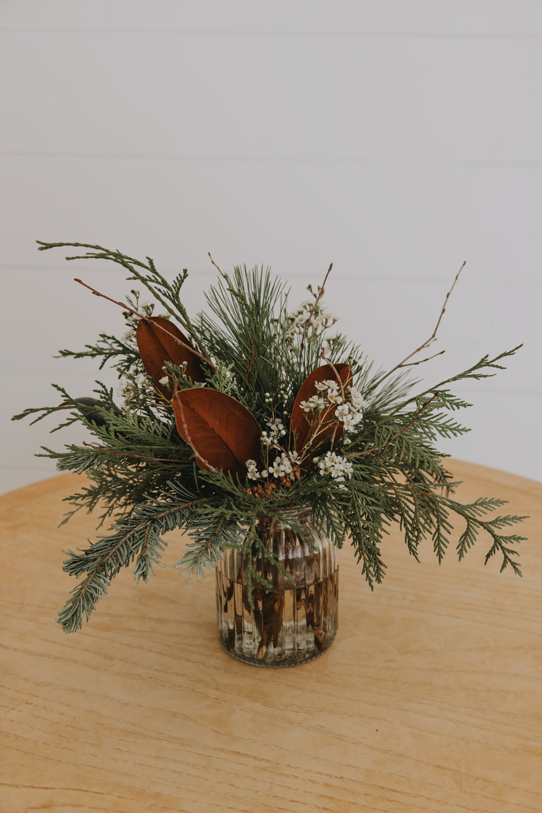 A fresh greenery arrangement featuring magnolia, cedar, and pine — perfect for those who love a natural, woodsy look with a hint of holiday magic.