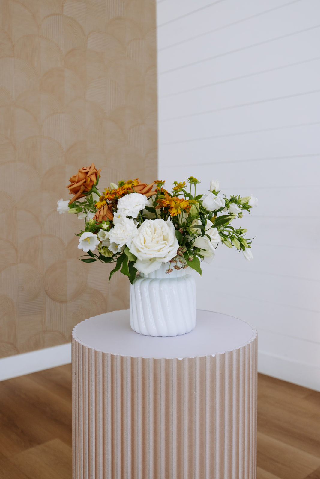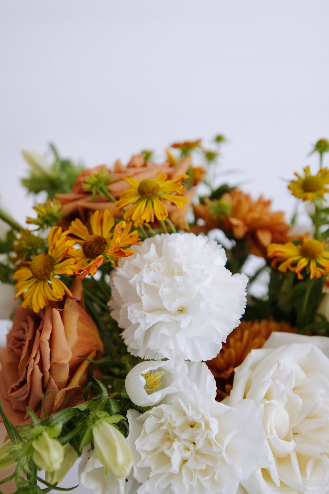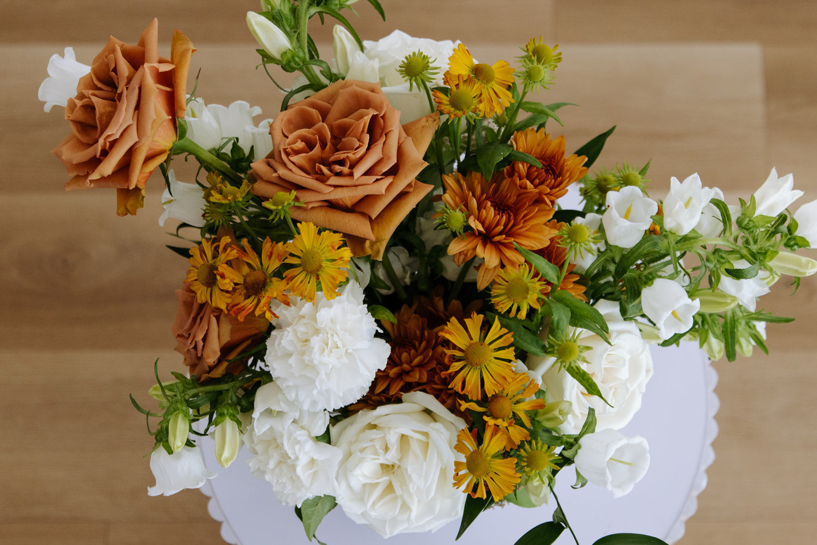 Warm caramel roses, amber mums, and crisp white blooms bring cozy autumn charm to this golden-toned design — a perfect nod to harvest season in the Rockies.