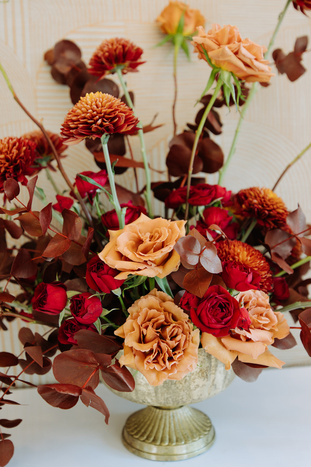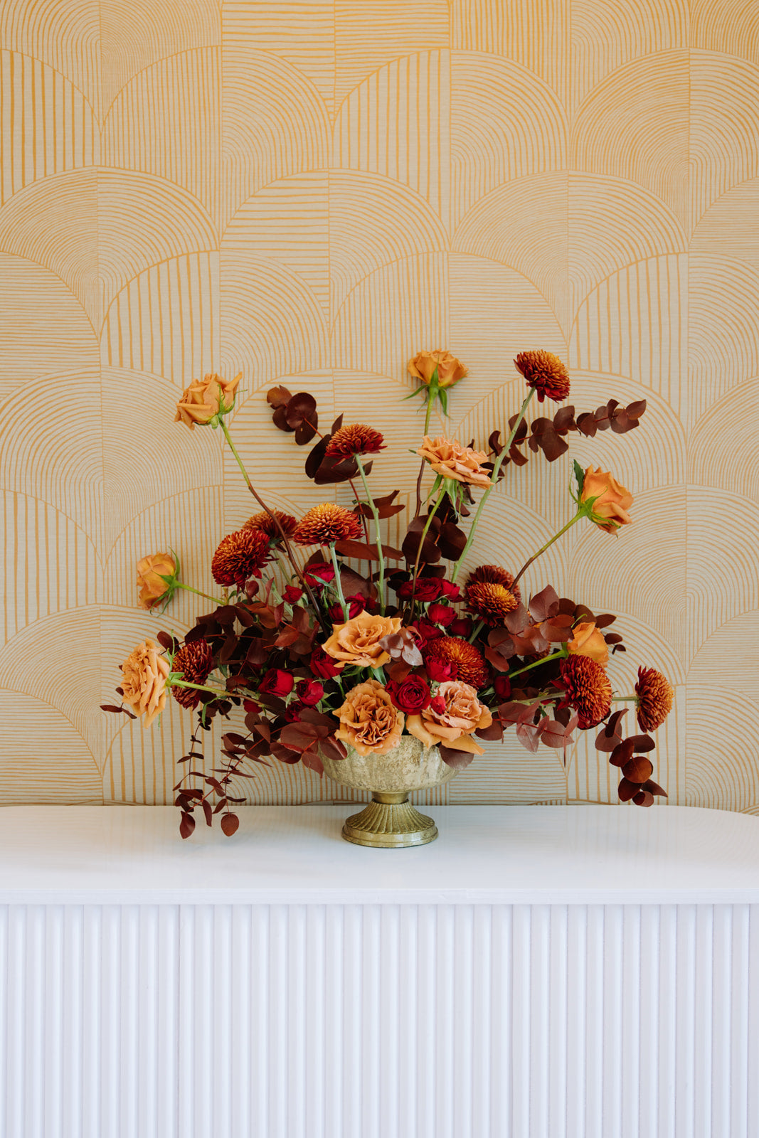 A sculptural arrangement of toffee roses, copper mums, and rich burgundy tones. Warm, bold, and refined — a perfect autumn statement piece.