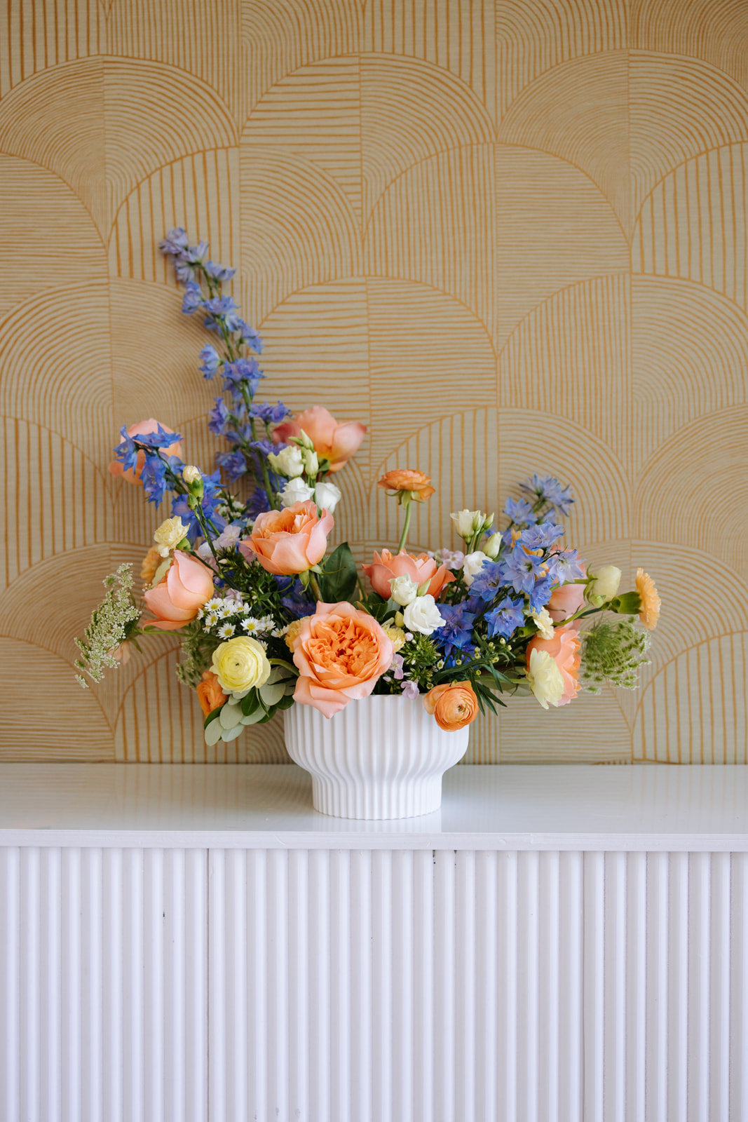 Soft peach garden roses meet sky-blue delphinium and buttery ranunculus in this airy, artful design. Loose, elegant, and full of movement — like a summer breeze through the Rockies.