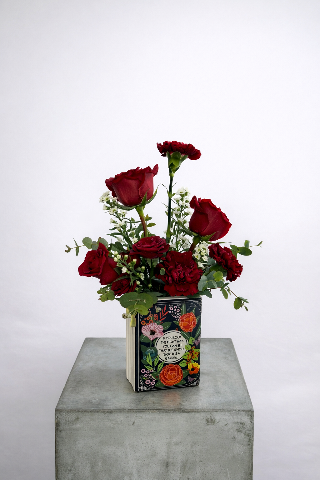 A moody, bookish arrangement for the romantics who fall in love between chapters—deep red roses and ruffled carnations with soft white accents and eucalyptus, styled in a keepsake ceramic book. Perfect for late-night reading, annotated paperbacks, and main-character energy