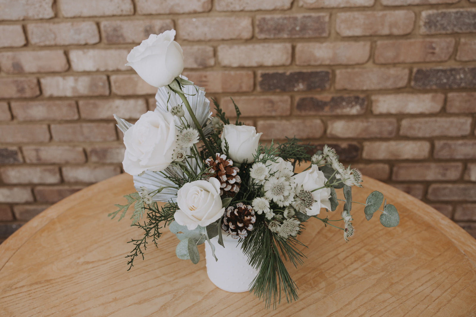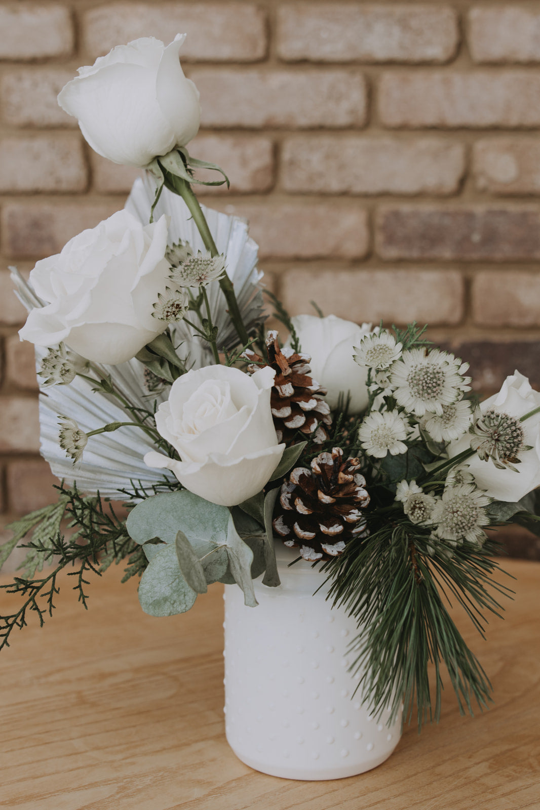 Elegant white roses, snow-dusted pinecones, and soft winter greens come together in a textured white vase. A timeless arrangement that feels like a breath of fresh mountain air.