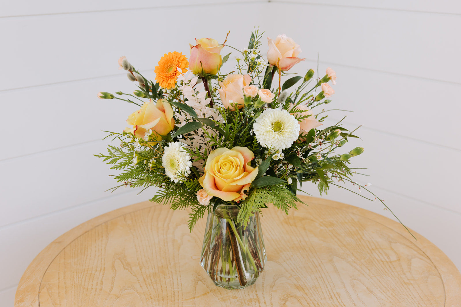 Soft yellow and peach roses paired with creamy blooms and fern greenery. A bright, effortless arrangement that feels like late-afternoon sunshine in the Rockies.