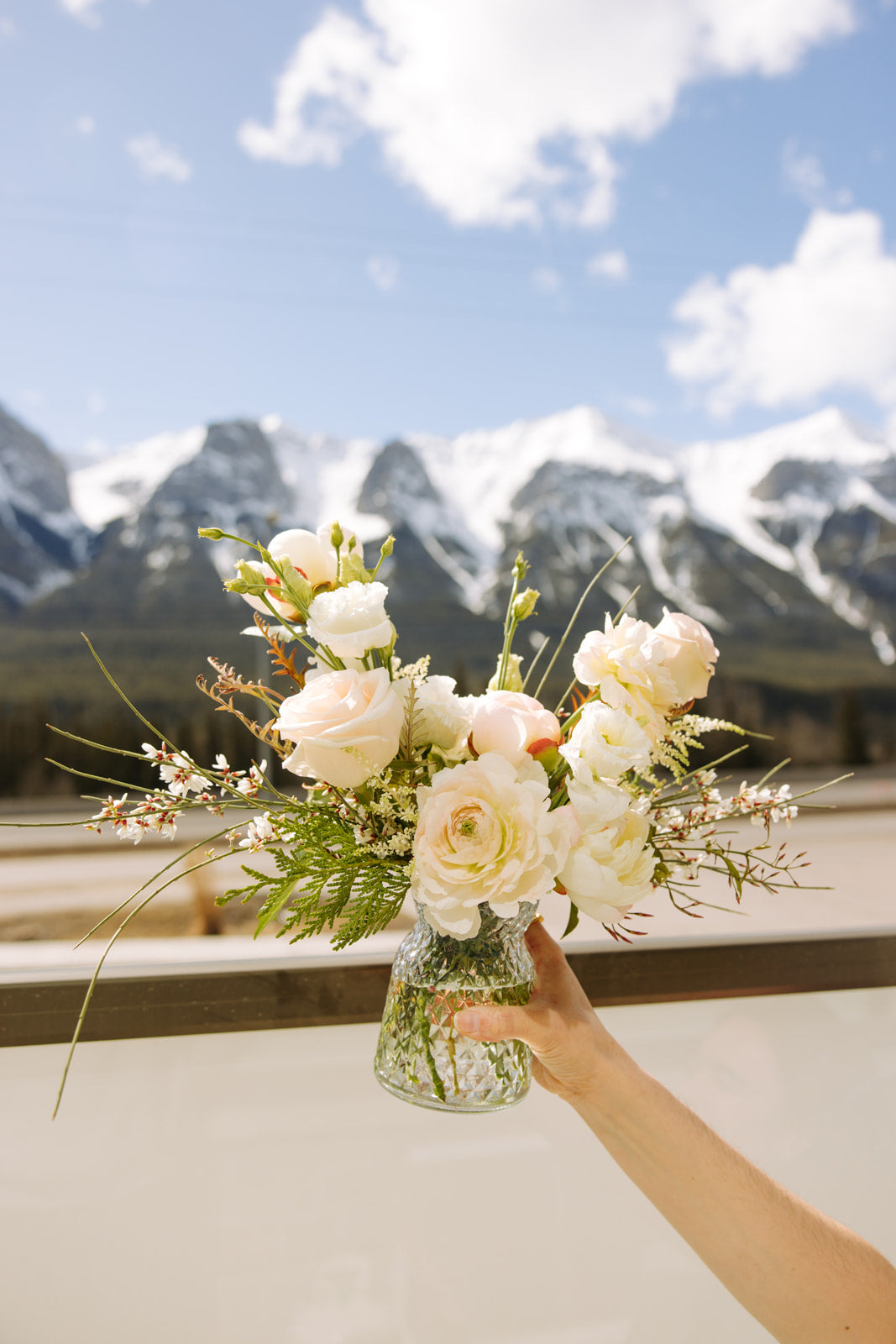 Creamy white and blush flowers arranged with airy greens — a nod to mountain light and fresh alpine air. A timeless, elegant favourite for any space.