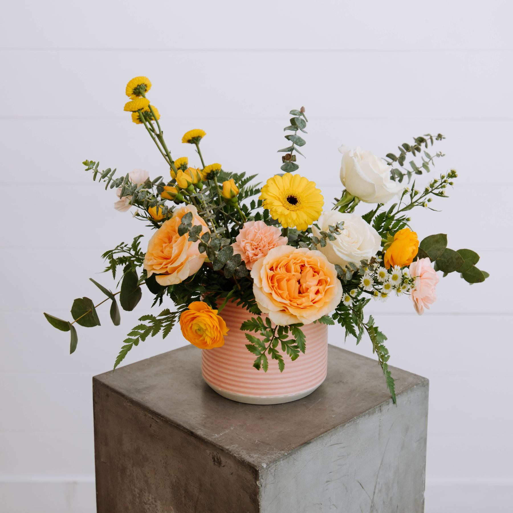 A cheerful mix of peach and white roses, sunny yellow blooms, and fresh greenery in a soft blush ceramic vase.